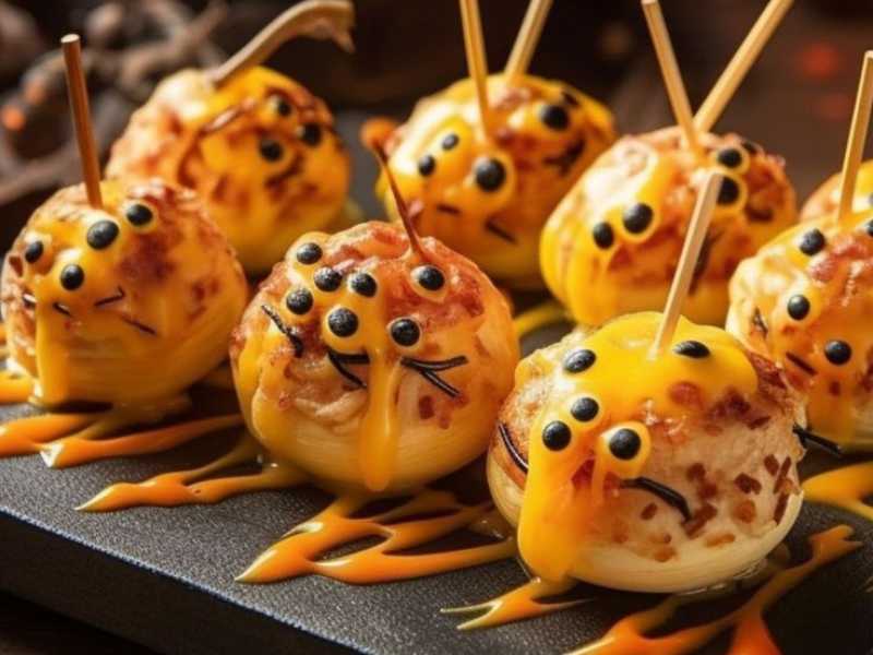 Prepare meatballs and place a slice of mozzarella cheese on top. Add a black olive to the center of the cheese to create the appearance of an eyeball. Spooky yet savory, these are perfect for jelly meatballs fans and lovers of Halloween doodles-inspired food.